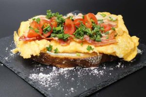 Unser 1913er belegt mit Rührei, Tomaten, Bacon und Kräutern