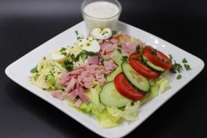 Frischer Salat mit Schinken, Ei, Tomaten und Gurken