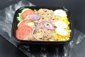 Frischer Thunfisch-Salat mit roten Zwiebeln, Ei, Tomaten, Gurken und Mais